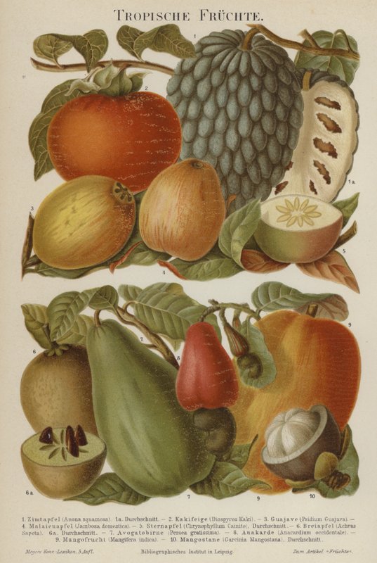 food · educational · fruit · cashew apple · sugar apple · encyclopedia · guava · mango · agriculture · exotic · malay apple · tropical · sugar-apple · nature · kaki fruit · star apple · crops · avocado · mangosteen · cainito · sapodilla · Private Collection / Bridgeman Images · / Look and Learn |