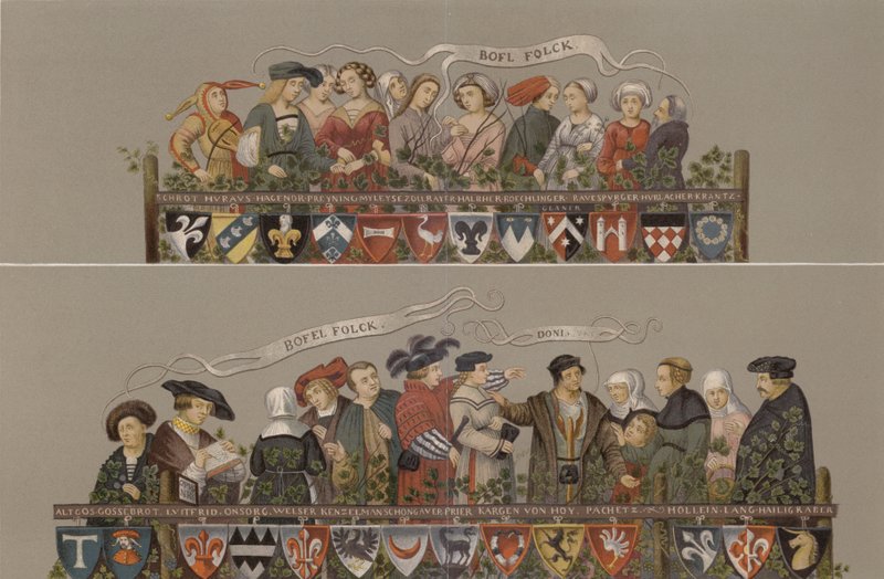 costume · heraldry · women · dancing · historical · shields · aristocracy · dance · 16th century · lords · nobility · ladies · dress · germany · german · history · augsburg · geschlechtertanz · Private Collection / Bridgeman Images · / Look and Learn |