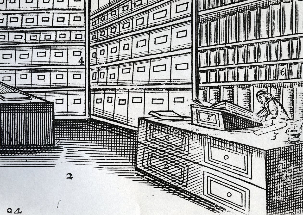orbis sensualium pictus · bookshop · childrens encyclopedia · picture book · john amos comenius · textbook · childrens education · language learning · shop · shopkeeper · store · bookshelves · illustration · Private Collection / Bridgeman Images |