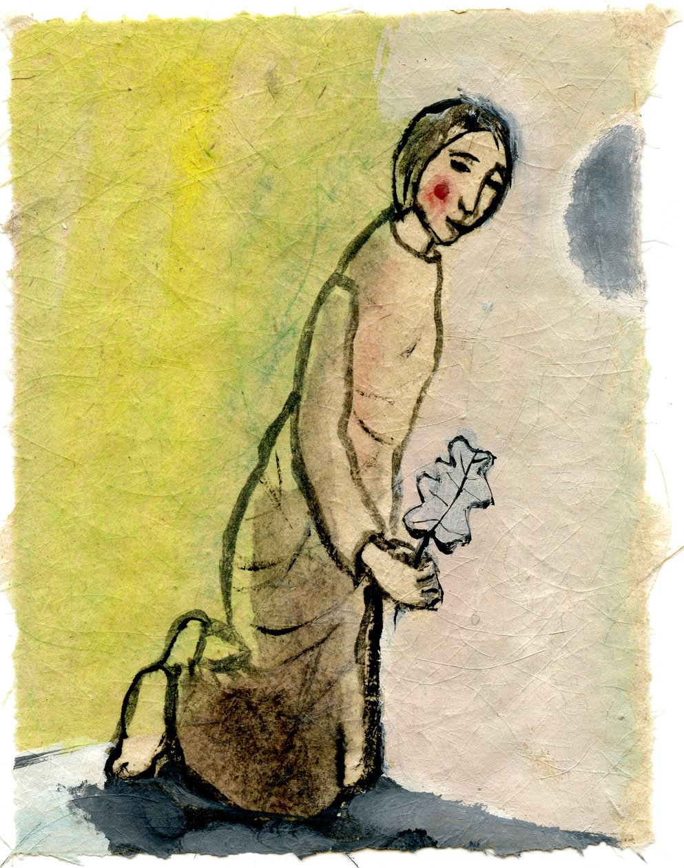 figure · kneeling figure · kneeling · kneel · prayer · worship · veneration · appreciation · simplicity · plenty · love · peace · thought · thoughtfulness · mindfulness · presence · wonder · clarity · holding · leaf · oak leaf · single leaf · moment · robe · dawn · balhandled · painting · watercolour · Private Collection / Bridgeman Images |