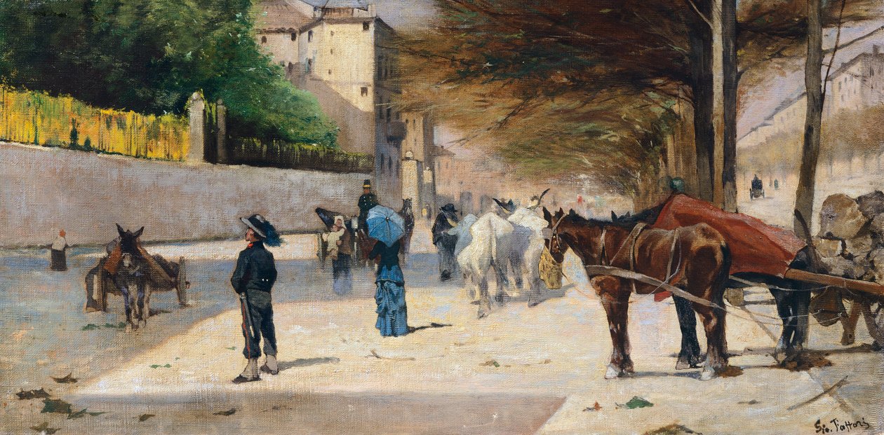 horse · horses · animal · wildlife · farm animal · livestock · tuscan school · cart · oil painting · italian regional art across the centuries · street · two animals · 19th century painting · italian culture · donkey · equidae · pedestrian · fine art painting · italy · 19th century · citylife · people in the background · outdoors · private collection · equus caballus · stone wall · europe · illustration and painting · horse · chordata · painting · perissodactyla · horizontal · giovanni fattori · fattori giovanni · animalia (animals) · mammalia (mammals) · / Bridgeman Images |