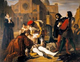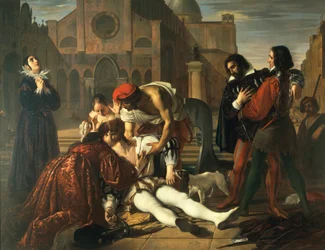 mourning · mouring · grief · grieving · mournful · italy · italian · italians · italian italian italian italian italian · italian italian italian italian italian italian italian italian italian italian · italian flag · europe · european · european union · e.c (european union) · e.e.c (european economic community) · prayer · pray · prayers · common prayer · prayer saying · prayed · worship · praying · supplication · tuscan school · bending · italian regional art across the centuries · building exterior · 19th century painting · centuries · standing · dead people · historical clothing · fine art painting · medium group of people · death · vertical · 19th century · sunlight · outdoors · sitting · architecture · 16th · hands clasped · misfortune · murder · loss · gesturing · pain · europe · painting · history · medici lorenzino de' · bezzuoli giuseppe · modern era (1492-1815) · giuseppe bezzuoli · pistoia municipal museum (museo civico) · lorenzino de' medici · / Bridgeman Images