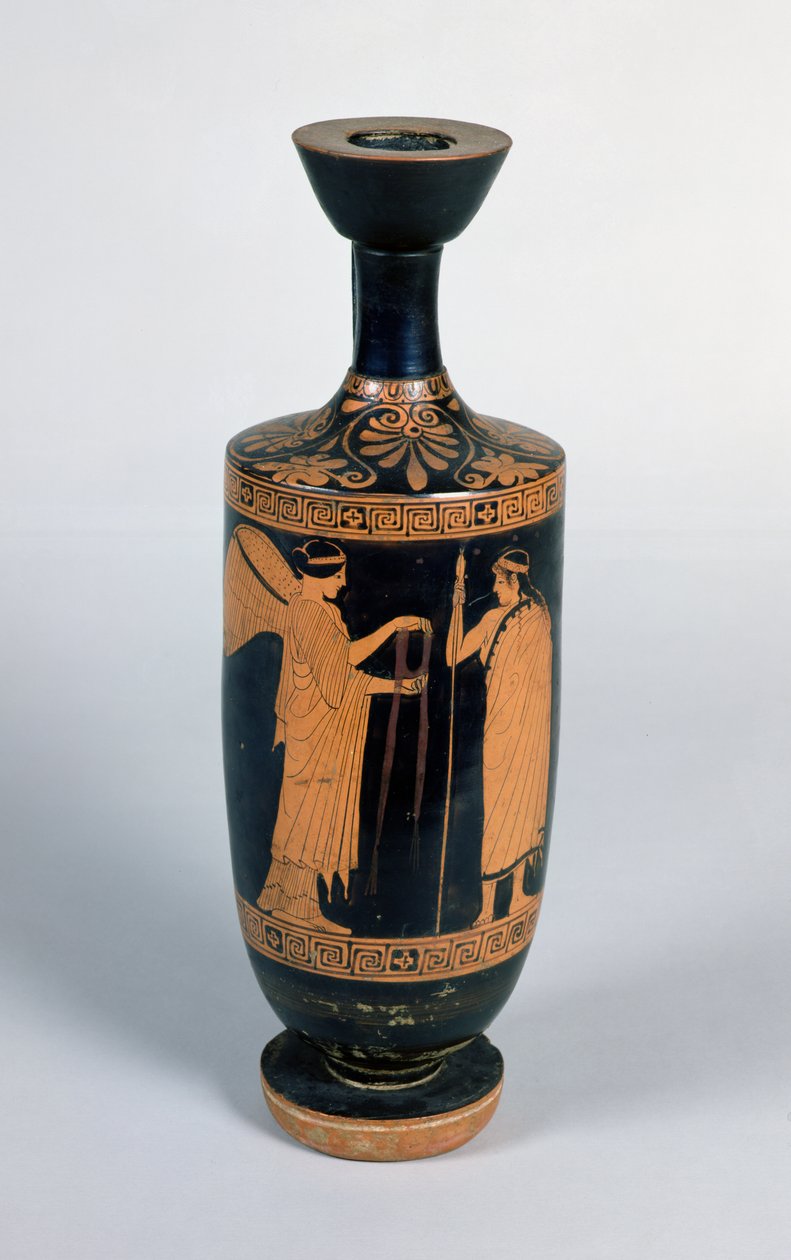 Attic Lekythos, Depicting a Nike Offering a Wreath to a Youth, c.480-470 BC(Attic Lekythos, depicting a nike (winged victory) offering a wreath to a youth, c.480-470 BC (ceramic))Greek |