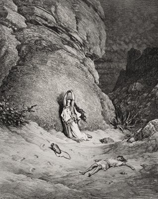 Hagar and Ishmael in the Desert, illustration from Dore's 'The Holy Bible', engraved by PiaudGustave (after) Dore |
