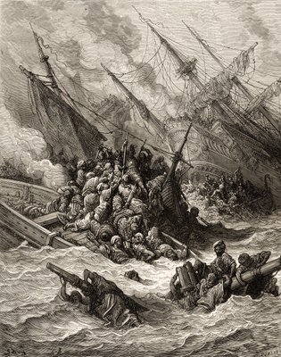 The Naval Battle of Lepanto, Engraving by Gustave Dore from 'The History of the Crusades' by Joseph Francois Michaud(“The Naval Battle of Lepanto” It set up a Spanish, Venetian alliance and Pope forces to the Ottomans in 1571 off Greece. Engraving by Gustave Dore (1832-1883) from “The History of the Crusades” by Joseph Francois Michaud)Gustave Dore |