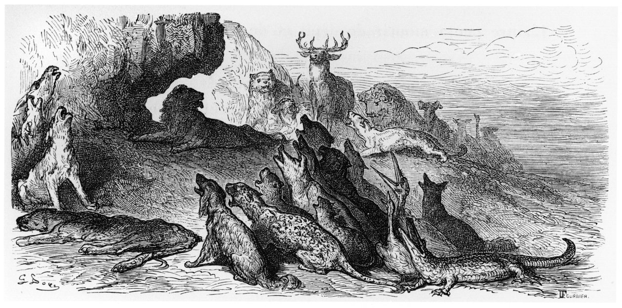 The Funeral of the Lioness, illustration from 'Fables' by Jean de La Fontaine, published 1868, engraved by Fournier(The Funeral of the Lioness, illustration from 'Fables' by Jean de La Fontaine (1621-95) Paris, published 1868, engraved by Fournier )Gustave Dore |