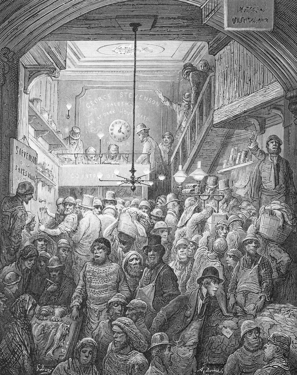 print · first edition · market · auction · merchant · gas lamp · fish · porters · leather helmet · bobbing hat · Private Collection / Bridgeman Images