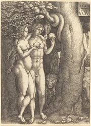 nature · germany · animal · tree · female · women · woman · people · male · couple · religious · fruit · garden · gardens · german · plant · plants · arts · country · religion · naked · nude · reptile · reptiles · snake · lion · apple · washington · christianity · location · century · gallery · temptation · print · biblical · concept · serpent · two people · nudity · art gallery · nakedness · old testament · garden of eden · tree of knowledge · black white · black and white · adam and eve · genesis · national gallery of art · 16th century · sixteenth century · trees · apples · artistic movement · book of genesis · etching · etching · portrait · heinrich aldegrever · old master · aldegrever · heinrich · art centre · heritage art · print · trippenmecker · Heritage Art/Heritage Images