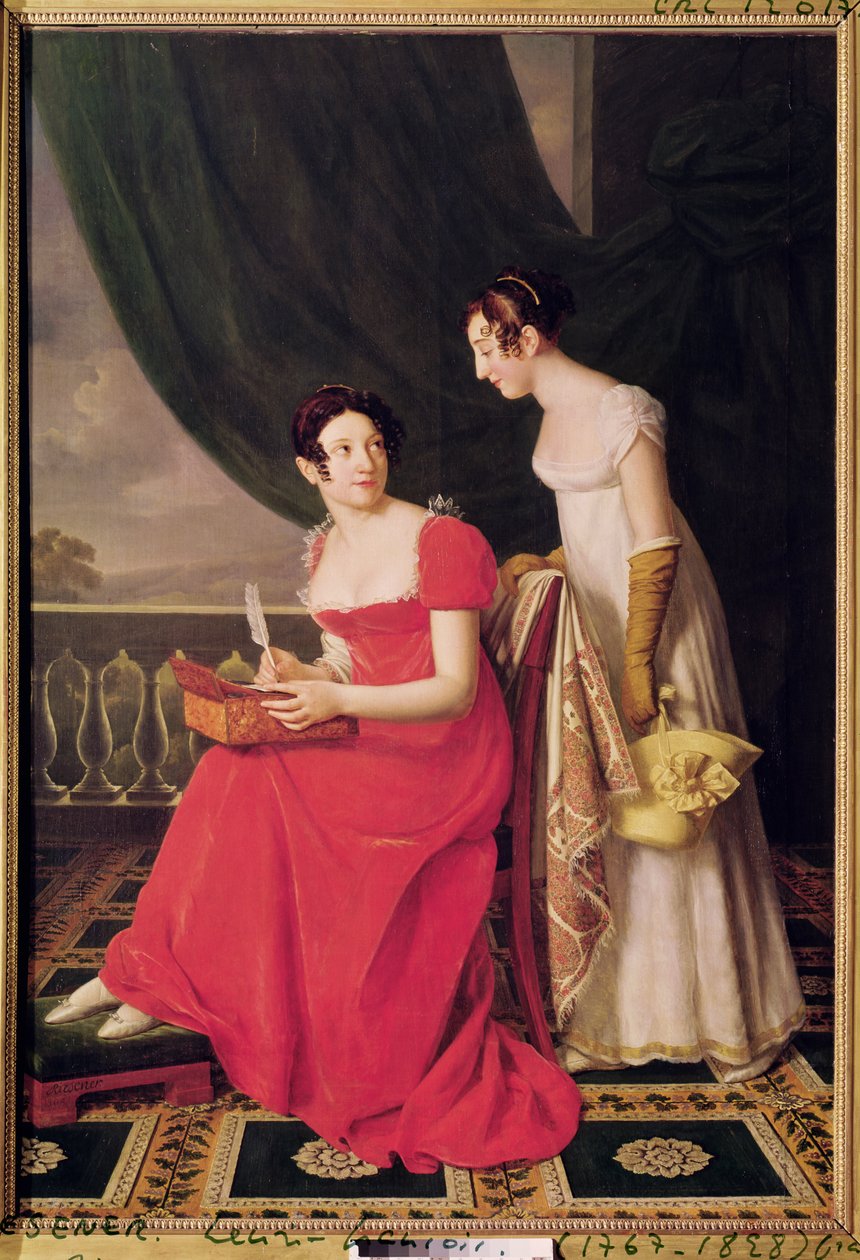wife of the artist · female · sisters · empire line dress · seated · writing · letter · gloves · footstool · curls · portrait · quill · interior · carpet · curious · nosy · paisley shawl · Musee des Beaux-Arts, Orleans, France / Bridgeman Images |