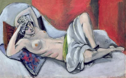1920s · 20th century · sofa · furniture · colour · woman · nudity · painting · pensive · headscarf · clothes · oil painting · reclining · matisse henri (1869-1954) · artist · france · europe · painter · mzpainting · interior · modern art · · Musee de l'Orangerie, Paris, France / Bridgeman Images