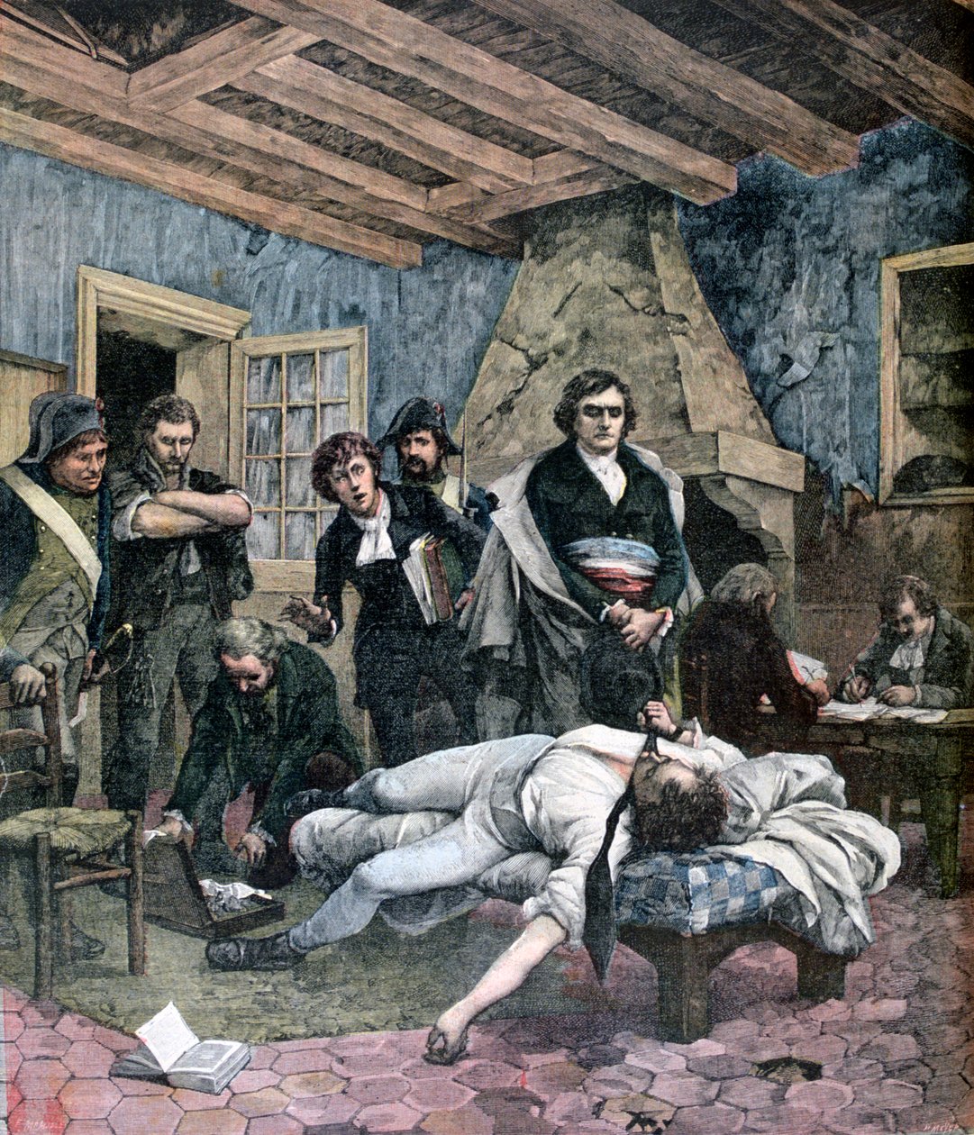 people · male · interior · indoors · country · french · france · crime · clothes · bedroom · room · lying · color · colour · killer · strangler · death · dress · military · beam · prison · location · century · inside · shirt · rebellion · criminal · general · murder · print · revolution · fireplace · concept · group of people · slaughter · thug · murderer · tiled · penitentiary · murdered · 19th century · nineteenth century · art media · bedchamber · french revolution 1789-1799 · murdering · slaughtering · charles · charles pichegru · meyer · pichegru · henri meyer · moreau de tours · tours · moreau de · meyer · henri · Art Media/Heritage Images