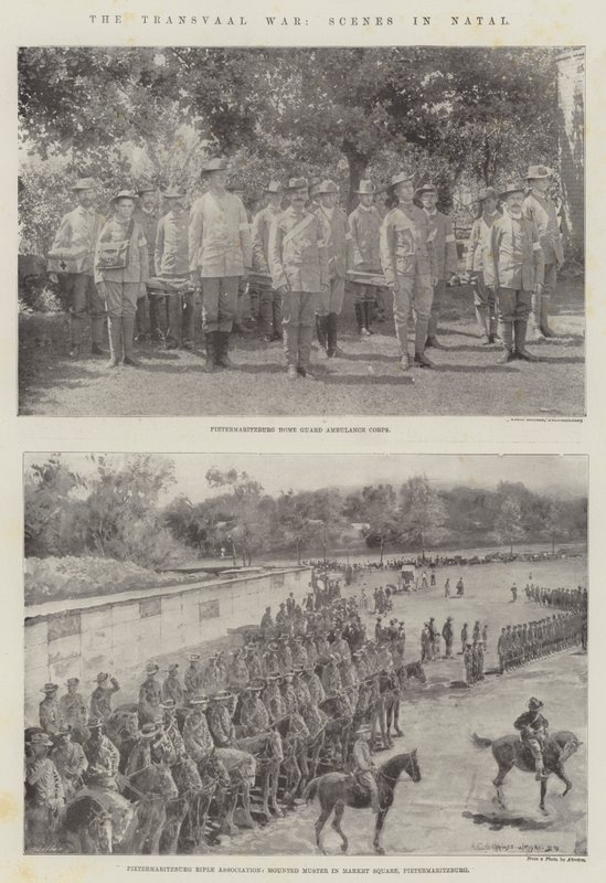 transvaal war · scenes · natal · pietermaritzburg home guard ambulance corps · pietermaritzburg rifle association · mounted muster · market square · pietermaritzburg · military · south africa · second boer war · Private Collection / Bridgeman Images · / Look and Learn |