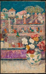 nature · people · architecture · education · flower · flowers · plant · plants · painting · country · balcony · balconies · rose · color · colourful · rooftop · rooftops · roof · location · century · vase · flower arrangement · homeware · oil painting · united states of america · architectural feature · colour · smithsonian institution · 19th century · begonia · background people · educational institution · nineteenth century · american · america · oil on canvas · scientific institution · purple · pink · object · still life · united states · oil on canvas · heritage art · henry golden dearth · dearth · henry golden · Heritage Art/Heritage Images