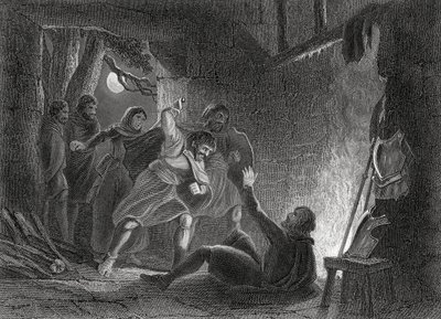 gerald fitzgerald · earl of desmond · irish · nobleman · leader · desmond rebellions · male · dying · death · murder · killing · rebel · moon · moonlight · cave · dark · fire · night · nocturne · pleading · gesturing · Private Collection / Bridgeman Images