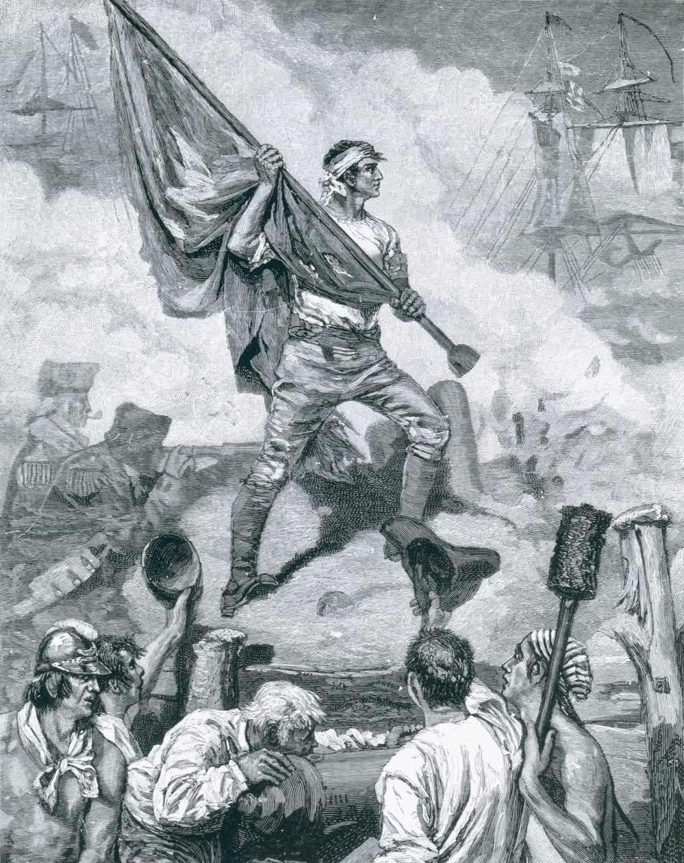 Sergeant Jasper at the Battle of Fort Moultrie, June 28th 1776, Illustration from 'The Dawning of Independence' by Thomas Wentworth Higginson, Published in Harper's Magazine, 1883(Sergeant Jasper at the Battle of Fort Moultrie, June 28th 1776, illustration from 'The Dawning of Independence' by Thomas Wentworth Higginson, pub. in Harper's Magazine, 1883 (litho))Howard Pyle |