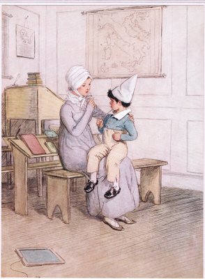 barrie · play · quality street · costumes · comedy · dresses · teacher · pupil · desk · shame · Private Collection / Bridgeman Images
