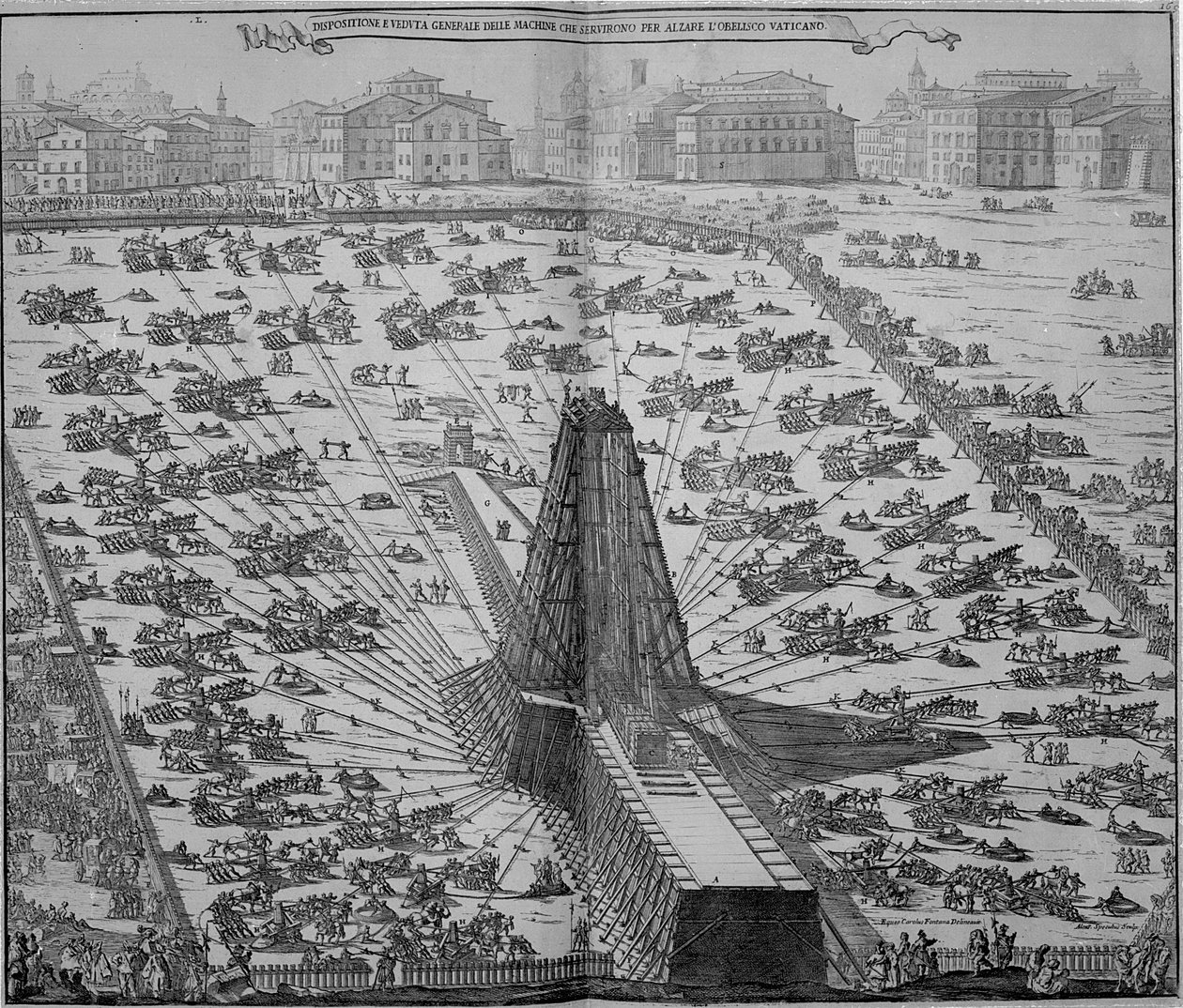 scaffold · scaffolding · erected · monument · vatican · building · construction · contructing · piazza · saint · place · wooden · structure · stone · device · granite · pulley · rope · panorama · pulling · workers · horses · workmen · labour · labourer · engineering · c13th- · Private Collection / Bridgeman Images |