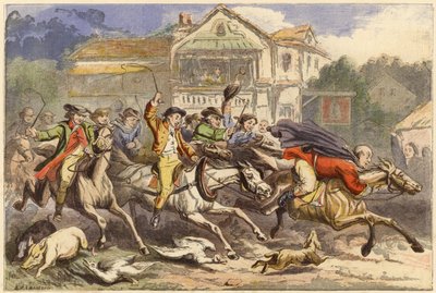 john gilpins famous ride · william cowper · poem · literature · shopkeeper · london · edmonton · gatekeeper · calenderer · donkey · highwayman · humour · riding · horse · comic · comedy · holding · duck · Private Collection / Bridgeman Images · / Look and Learn