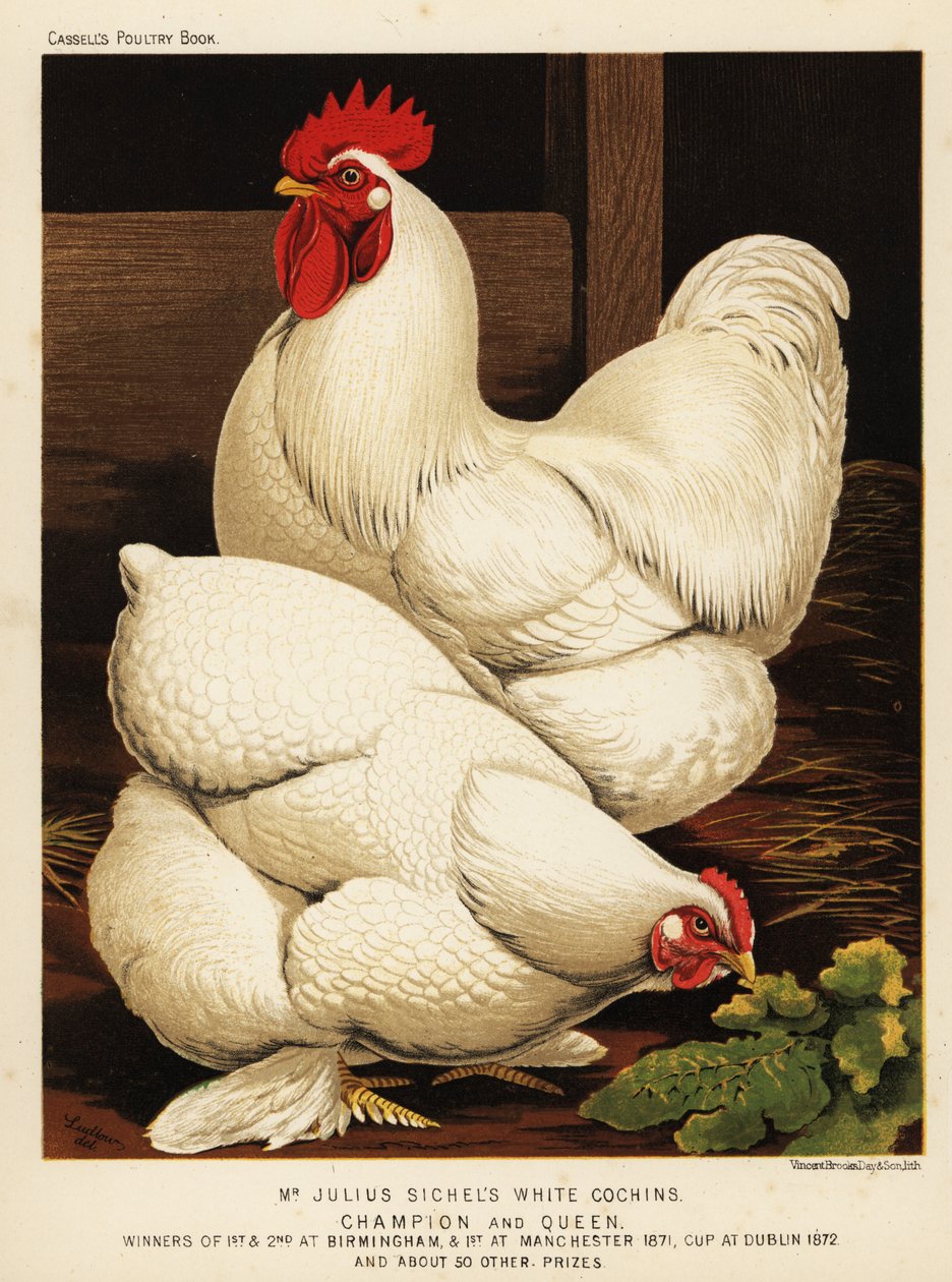 game · play · player · games · white cochin · julius sichel · champion · queen · gallus gallus domesticus · winner · birmingham · manchester 1871 · dublin 1872 · chromolithograph · vincent brooks day · illustration · j.w. ludlow · lewis wright · the illustrated book of poultry · cassell · victorian · hen craze · poultry breeding · ornithology · game bird · show bird · exotic · plumage · cock · cockfighting · hen fever · Chinese · cochin-china · / Bridgeman Images