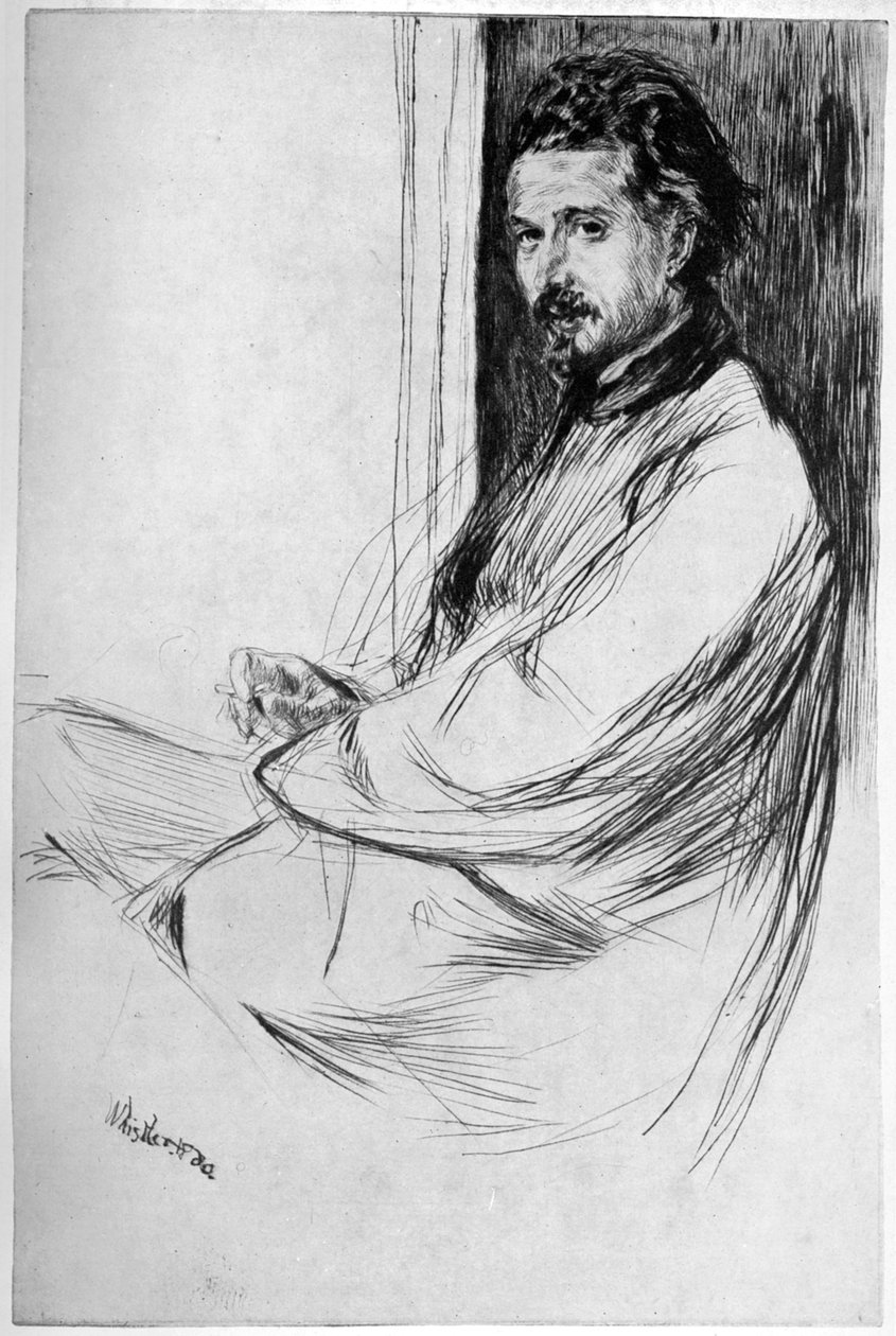 people · male · sitting · arts · painting · posing · body · model · clothes · beard · dress · century · print · bearded · signature · monochrome · smock · 19th century · black white · black and white · 1900s · 20th century · nineteenth century · artistic movement · etching · the body · direct gaze · work of art · axenfeld · tonalism · james abbott mcneill whistler · james mcneill whistler · j.a mcneill whistler · ja mcneill whistler · mortimer l · mortimer l menpes · menpes · mortimer menpes · whistler · james abbott mcneill · whistler · james mcneill · The Print Collector/Heritage Images