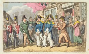 election riot · westminster by election · bayonets · guards · magistrate · kneeling · satirical · cartoon · caricature · soldiers · whig · banner · unrest · protest · Private Collection / Bridgeman Images |