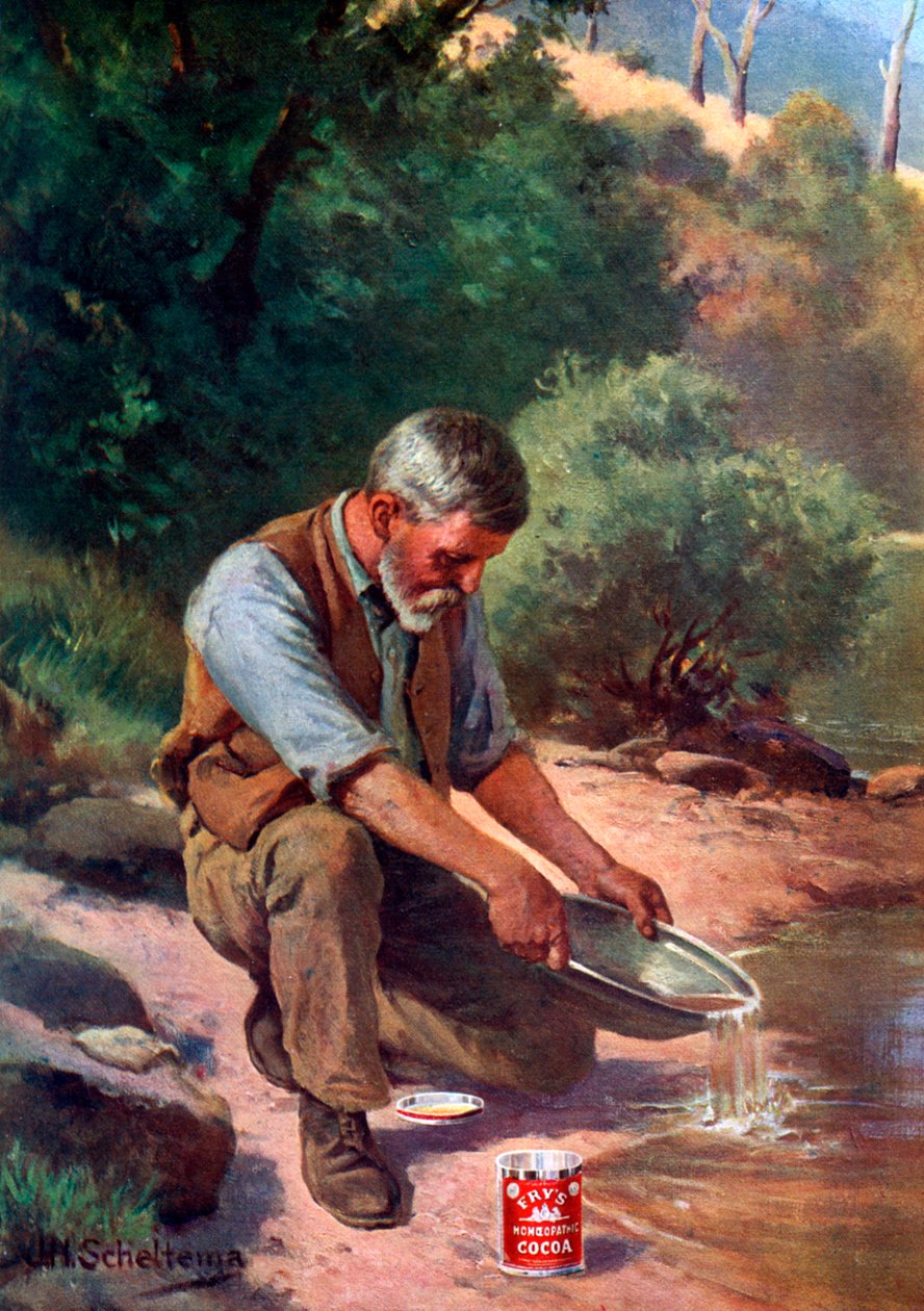 river · water · food · people · male · painting · metal · clothes · geography · grey hair · color · colour · dress · gold · labour · hair · kneeling · century · chocolate · print · waistcoat · confectionery · cocoa · facial hair · prospecting · 19th century · edwardian · 1900s · 20th century · nineteenth century · prospector · geographical feature · fry's chocolate · william · aw penrose · penrose · a w penrose · william gamble · gamble · jan hendrik scheltema · scheltema · jan hendrik · The Print Collector/Heritage Images