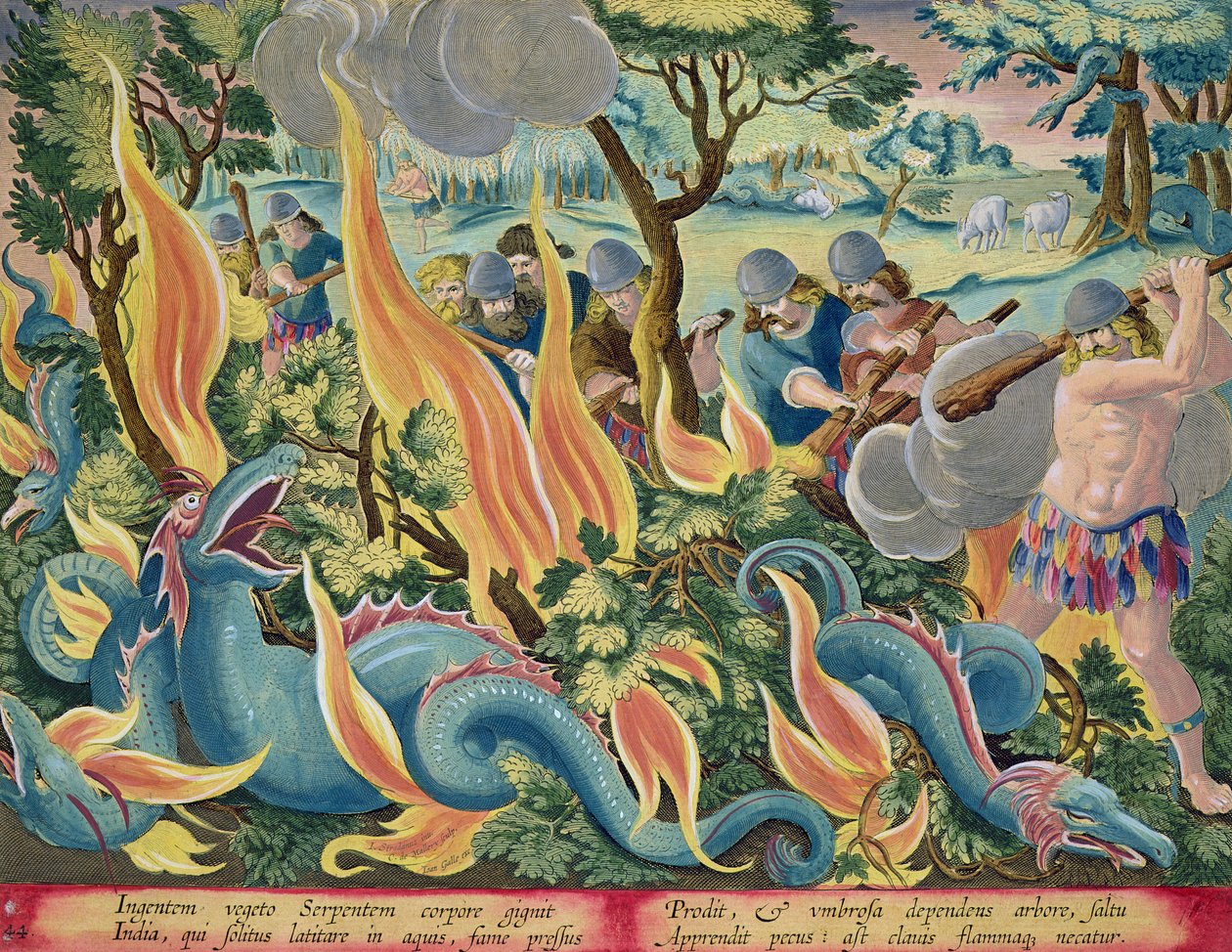 dragon · snake · monster · club · fire · flames · burning · hunt · hunter · huntsman · Private Collection / Bridgeman Images |