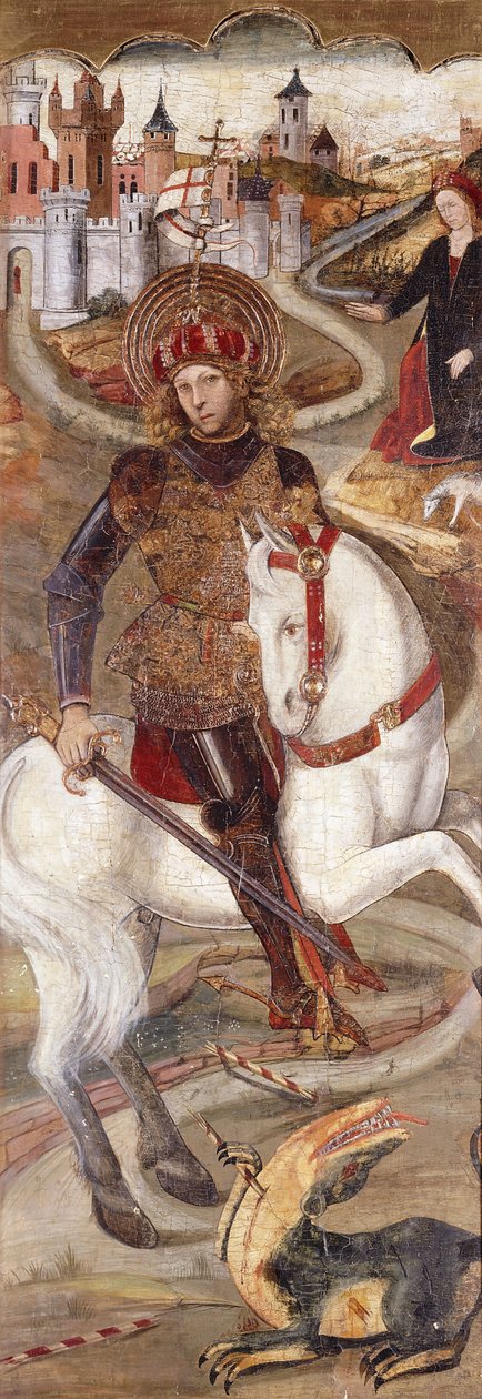 sword · saint · christian · religious · mid 15th century · mythology · oil painting · dragon · oil on panel · two animals · old master paintings · hero · gothic era · fine art · circle · outskirts · mid fifteenth century · princess · arms · rider · armed · horseback · spanish artist · equine · historic · weapon · bravery · royalty · heroic · spanish art · european artist · artist spanish · hooved mammal · patron saint · monarchy · mythical creature · near · 15th century · creature · saint george · association · brave · riding · mammal · artist european · animal · mythological · christianity · positive concepts · circle of · fifteenth century · royal person · two people · equestrian · weaponry · gothic · myth · artwork · artist-spanish · olden time · courage · mythical · horse · painting · history · religion · huguet · st georges · jaime huguet · sadra · george · st george · st · Private Collection / Bridgeman Images |