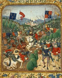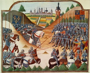 Battle of Azincourt (1415)(Battle of Azincourt (1415). During the Hundred Years' War Henry V of England defeated the French Armagnacs party - in “Grandes Chronicles de France” by Jean Fouquet, around 1467 - 1476). Victoria & Albert Library)Jean Fouquet |