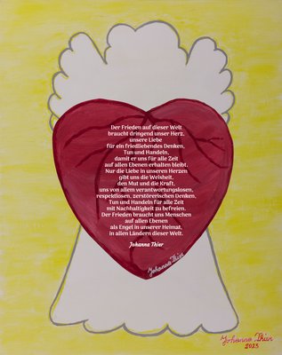 The peace picture of Johanna Thier may for all times give the people again and again on all levels in all challenging times and situations thought impulses to live again and again the love in thinking, doing and acting in order to sustainably maintain peace and a healthy mother earth in the homeland, in all countries. Long live love on all levels for all time, long live peace on all levels for all time in all countries of this world.
