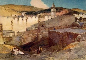 exterior · outdoors · people · male · religious · mosque · painting · sunlight · religion · science · view · solar system · astronomy · color · brown · shadow · shadows · israel · walled · zion · holy land · judaism · jewish · islam · islamic · minaret · minarets · darkness · sunlit · location · century · cream · colour · old testament · background people · abraham · hebron · 1900s · 20th century · west bank · outside · watercolour · landscape · cream colour · john fulleylove · fulleylove · john · black · adam charles black · ac black · cave of the patriarchs · mosque machpela · adam charles · ibrahimi mosque · The Print Collector/Heritage Images