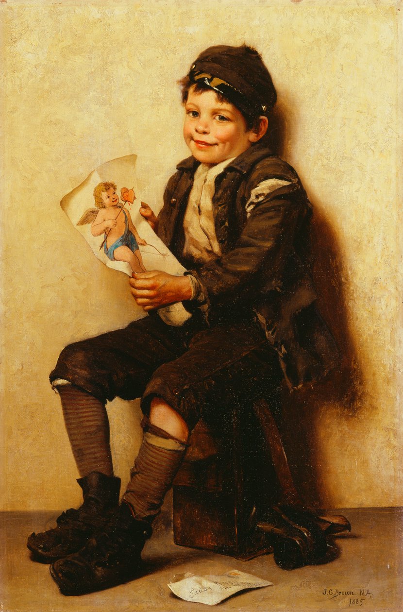 one boy only · relationship · outdoor · nineteenth century · time of day · 1880s · smile · valentine · smiling · oil on canvas · oil painting · poor · naturalism · brown · cheerful · artist american · poverty · jacket · outside · apparel · container · daytime · artist-american · garment · people · happy · affair · expression · american painting · clothes · full length · coat · shoeshine · realist · realism · headwear · social issues · human · occupation · posture · destitute · late nineteenth century · john george brown · 19th century · ripped · happiness · valentines day · inside · indoors · person · seated · boys · outdoors · sitting · hardship · opressed · late 19th century · positive concepts · clothing · romantic · full-length · third class · dress · indoor · outer garment · male · attire · artwork · crate · american artist · facial expression · using hands · romance · holding · one person · social commentary · painting · rags · st valentines · valentines day · paddy · 1885 · Private Collection / Bridgeman Images |