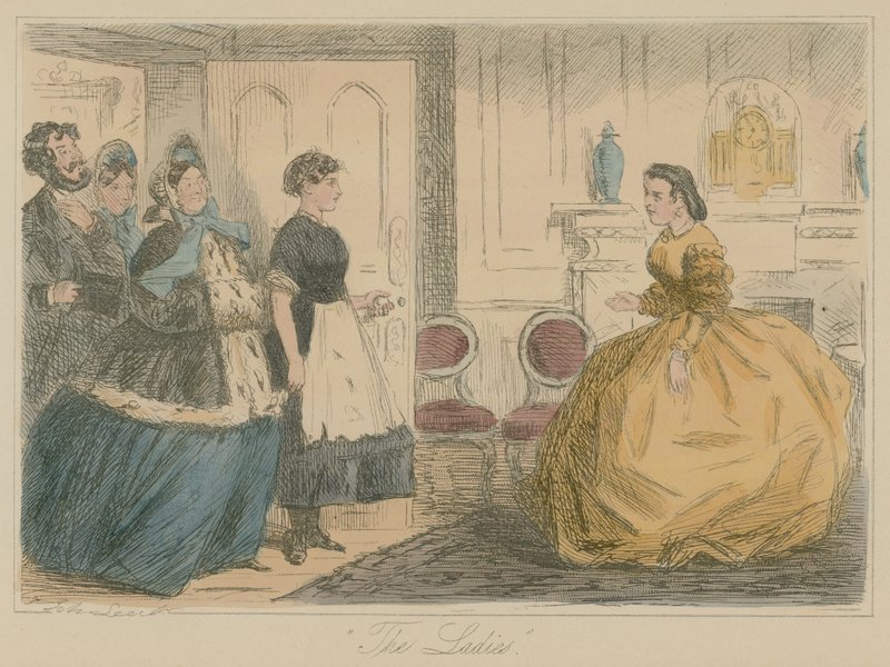 mr facey romfords hounds · robert smith surtees · british · english · novel · literature · hunting · women · meeting · visit · visiting · dress · costume · victorian · introduction · Private Collection / Bridgeman Images · / Look and Learn |