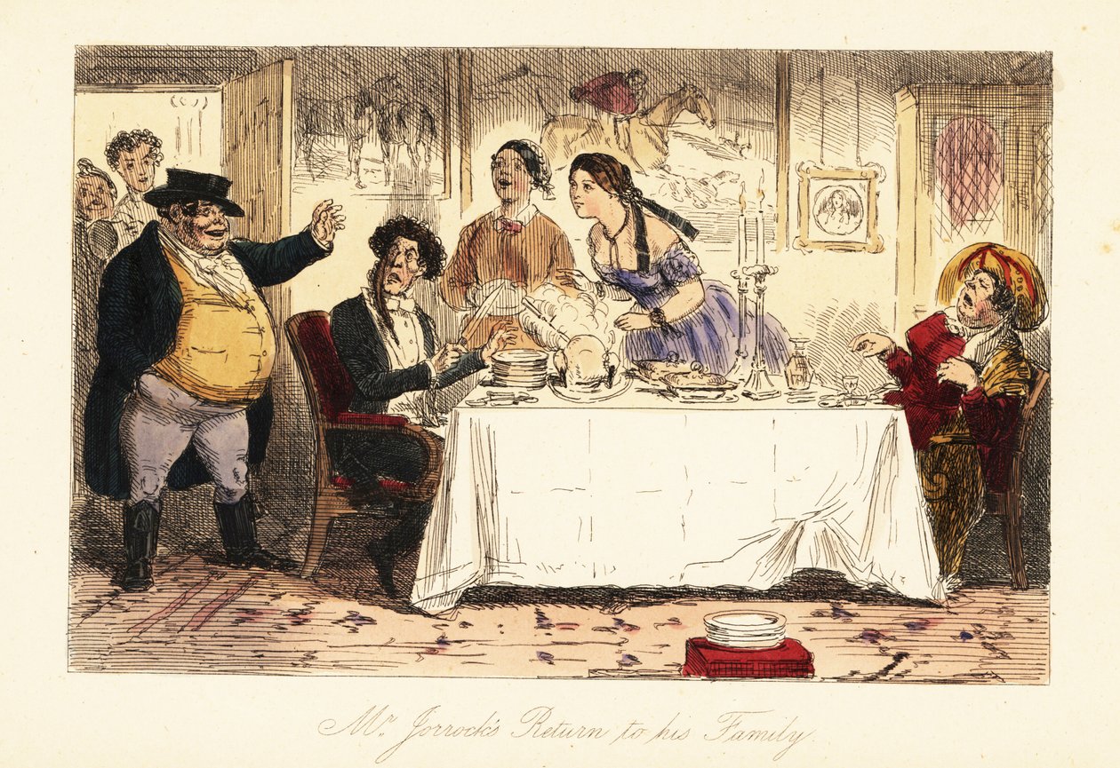 english · grocer · cockney · vulgar · class · snobbery · dinner · supper · dining room · family · 19th century · mr. jorrocks · mrs jorrocks · turban · captain doleful · carving · roast · bird · belinda · table · mr. jorrock’s return to his family · handcoloured · steel engraving · illustration · john leech · robert smith surtees · victorian era · caricature · comical · humor · handley cross · or mr. jorrocks’s hunt · / Bridgeman Images |