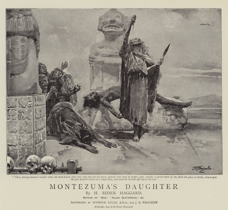montezumas daughter · h rider haggard · donned · scarlet · cloak · head · priest · felt · heart · uttered · prayer · raising · curved · knife · flint · like · glass · itztli · struck · poor · wretch · breast · blow · ancient · offering · Private Collection / Bridgeman Images · / Look and Learn |