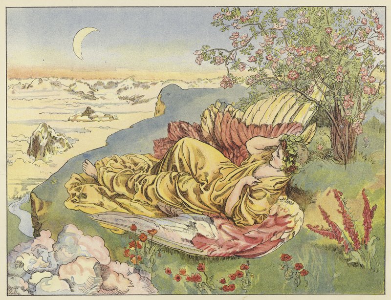 flower · flowers · floral · legend · legends · legendary · fantasy · fantastical · fairy · wonderful · magical · the moss rose · tree · mist · moon · girl · beauty · Private Collection / Bridgeman Images · / Look and Learn |