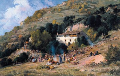 Everyday Life, Italy The Departure of the Crusaders, 1863 The Departure of the Crusaders Pilgrimage to Longeborgne A Bullfight The Beggars Coming to Town Landscape and Peasants of Anticoli The Nut Harvest at Grenoble Refugees from Village Fire A Village Festival Maypole Festival in Front of a Forest Tavern Midsummer Fire The Highest Point, Catalonia The re-establishment of worship after the Revolution Fire in the Village Country Festival Gypsy Encampment, Granada, Spain Country Lane with Gypsies A Landscape with Figure in Sagunto Valencia Battle of Palestro: the Austrians rushing into the ditch at Sartirana Bullfight in Éibar Bullfight in Eibar Landscape Inspired by the View of Frascati Scene of Monastic Life: Monks Breakfast, Praying and Reading in an Undergrowth Saint Catherine in Valfurva Sketch for Washing Day near Perugia Landscape of San Cristóbal Romita View of the Villa Medici, Ottaviano