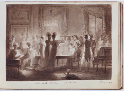 meridiana · pavilion · pitti · palace · salon · society · male · female · interior · italian · italy · florence · society · elegant · fashion · fashionable · chandelier · lamp · entertainment · elisa bonaparte · album · empire line · dress · First · Bibliothèque Paul-Marmottan, Ville de Boulogne-Billancourt, Académie des Beaux-Arts, France / Bridgeman Images