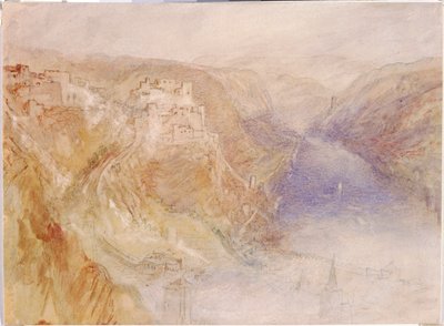 outdoors · germany · river · scenic · building · buildings · fort · painting · view · geography · color · colour · rhine · cliff · cliffs · paper · fortification · rhineland palatinate · century · distant · hazy · koblenz · concept · river rhine · haze · 19th century · elevated view · nineteenth century · ehrenbreitstein · feste ehrenbreitstein · festung ehrenbreitstein · geographical feature · watercolour · pencil · landscape · arial view · jmw turner · j m w turner · turner · joseph mallord william · joseph mallord william turner · national museum cardiff · kay kays · joseph turner · National Museum of Wales/Heritage-Images