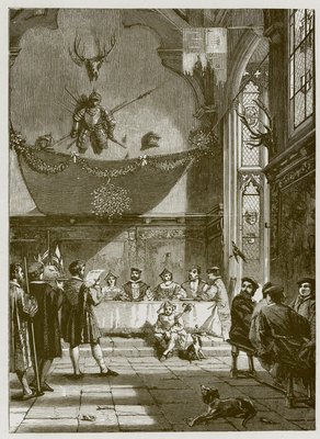 ballad · good ale · beer · drinking · dinner · country · house · hall · Private Collection / Bridgeman Images · / Look and Learn