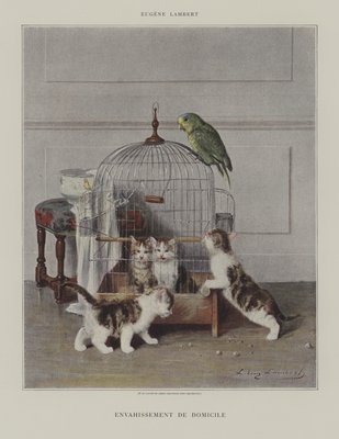 19th century · animal · baby animal · cage · colour · france · europe · bird · parrot · stool · furniture · print · illustration · interior · · Private Collection / Bridgeman Images
