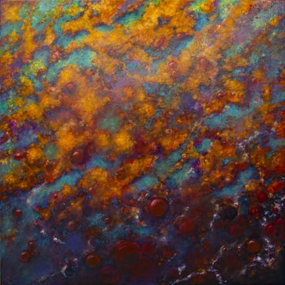 abstract · textures · rusty · crusty · rust · reds · golds · turquoise · craters · cracks · rust bubbles · one of panel of two · painting · watercolour · organic textures · science · Private Collection / Bridgeman Images