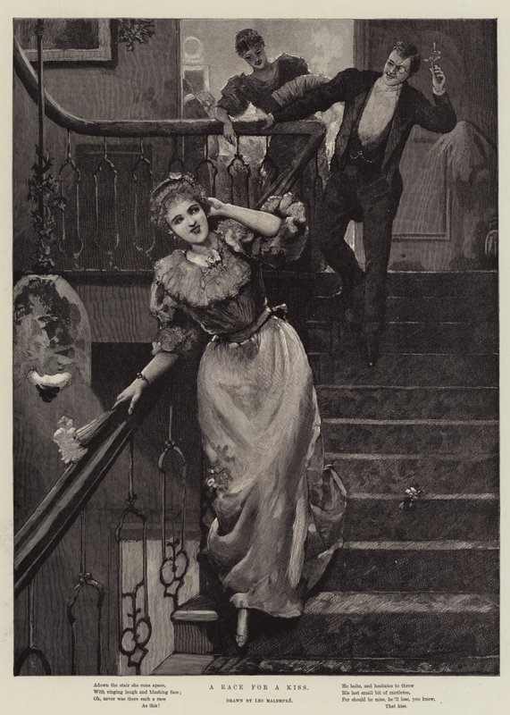 race · kiss · festivities · christmas · staircases · mistletoe · Private Collection / Bridgeman Images · / Look and Learn |