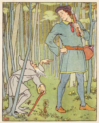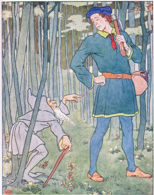 nursery stories · the golden goose · woods · costumes · little · grey · walking stick · Private Collection / Bridgeman Images