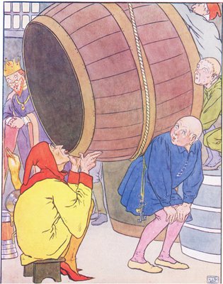 nursery stories · the golden goose · cellar · cask · wine · drank · costumes · Private Collection / Bridgeman Images