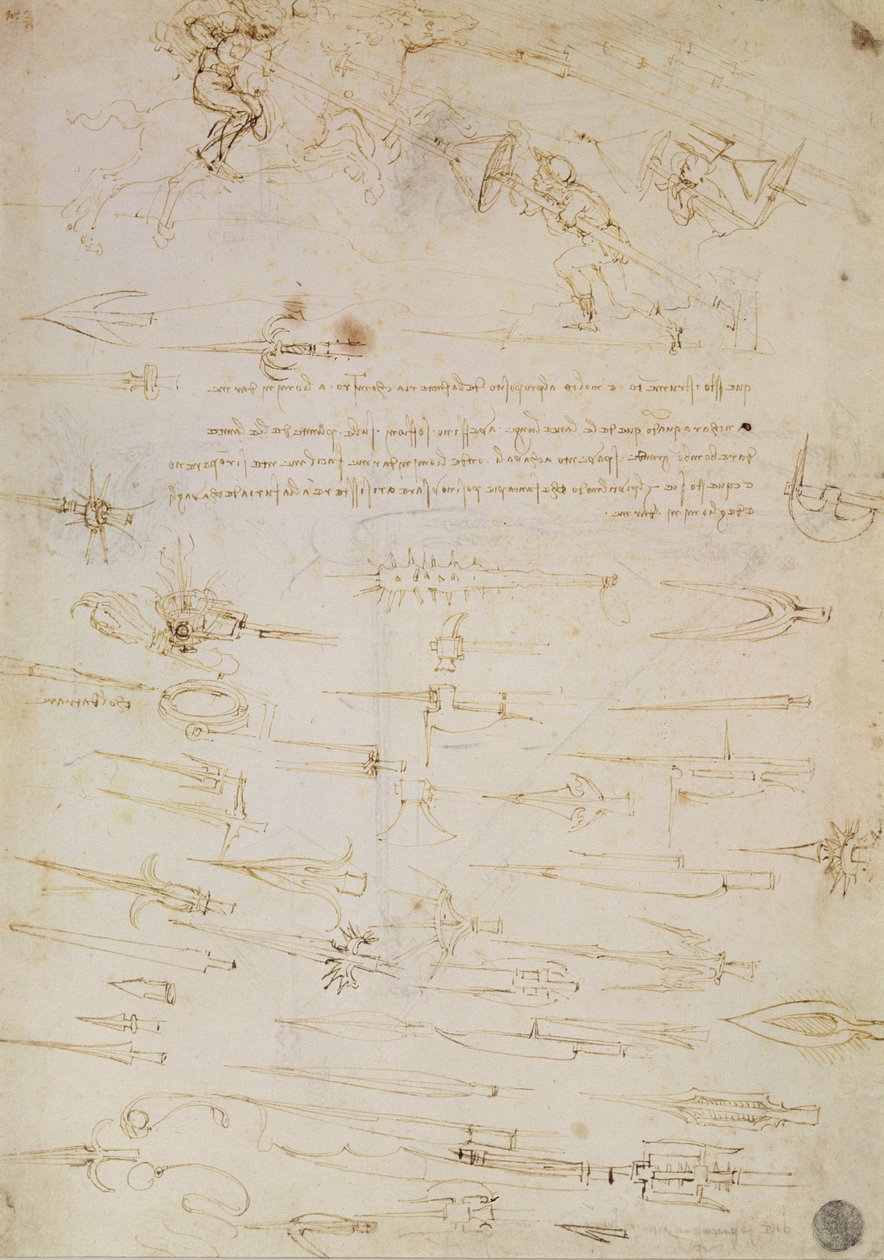 Sheet of studies of foot soldiers and horsemen in combat, and halbards, 1485-1488(Sheet of studies of foot soldiers and horsemen in combat, and halbards, 1485-1488 (pen and ink on paper))Leonardo da Vinci |