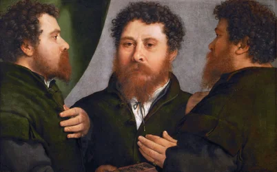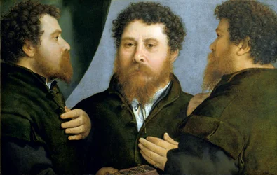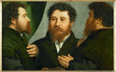 Portrait of a Goldsmith in Three Positions(Renaissance : Triple portrait d'orfevre - Portrait of a Goldsmith in Three Positions par Lotto, Lorenzo (1480-1556), ca 1530. Oil on canvas, 52x79. Art History Museum, Vienne)Lorenzo Lotto |