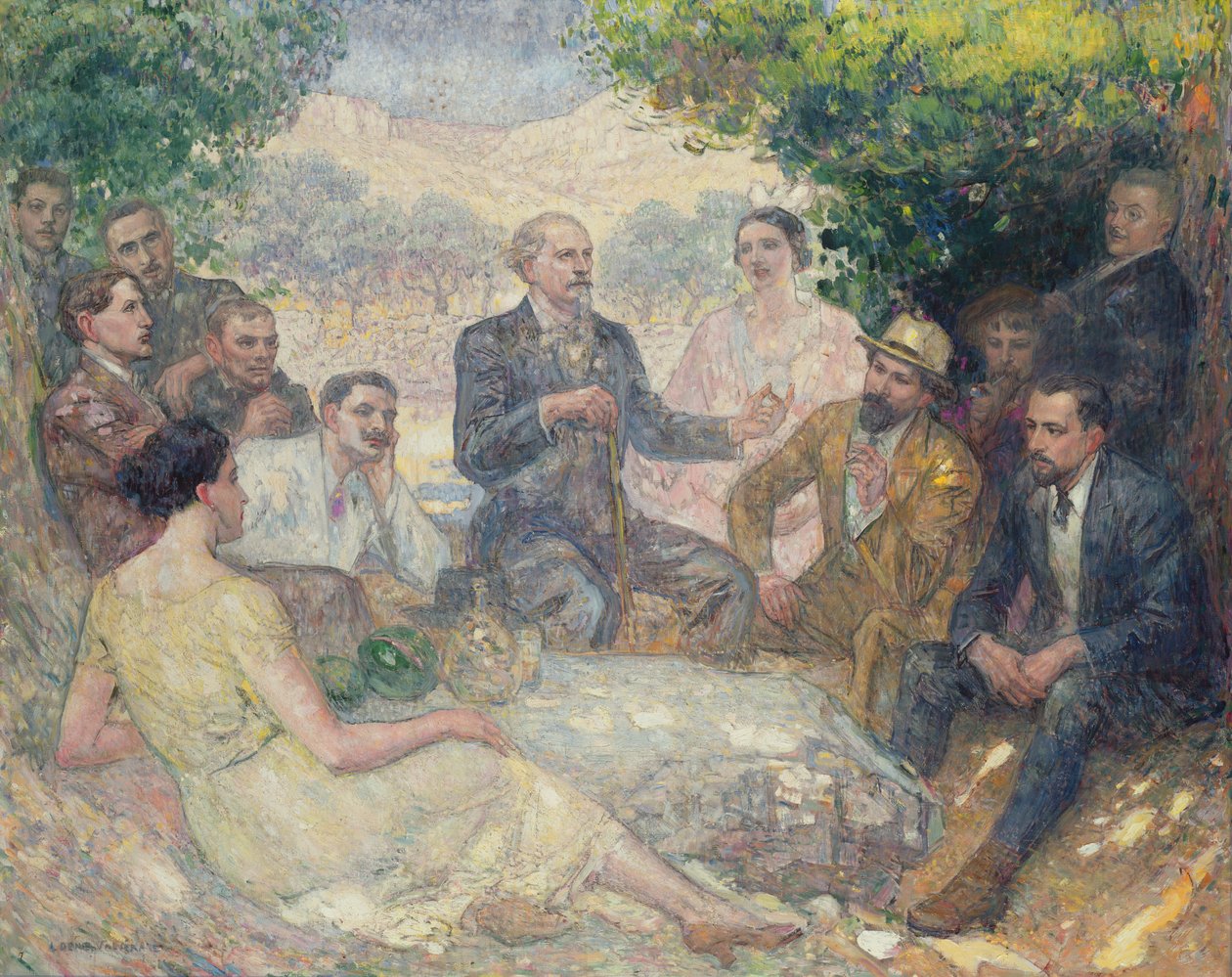 group · writers · authors · seated · outdoors · landscape · provence · mountains · picturesque · rural · countryside · shade · rocks · rocky · male · female · relaxing · socialising · talking · gesture · gesturing · listening · conversing · conversation · c19th · c20th · gathering · Musee des Beaux-Arts, Nimes, France / Bridgeman Images |