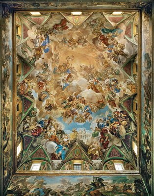 The Celestial Glory and the Triumph of the Habsburgs, from the ceiling above the grand staircase(The Celestial Glory and the Triumph of the Habsburgs, from the ceiling above the grand staircase )Luca Giordano |