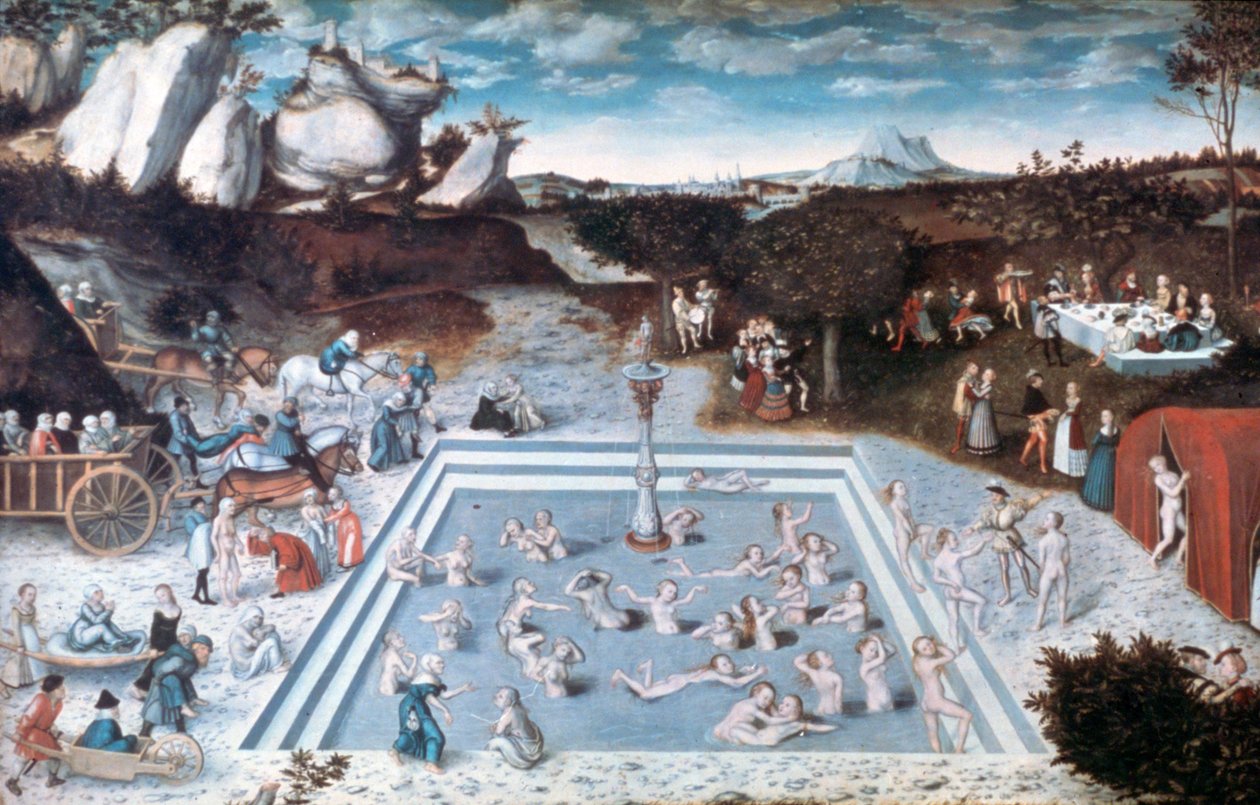 germany · people · landscape · german · arts · painting · swimming · country · bathing · swimming pool · color · colour · renaissance · location · century · legend · mythology · legendary · 16th century · sixteenth century · art media · fountain of youth · lucas cranach the elder · cranach the elder · lucas · Art Media/Heritage Images